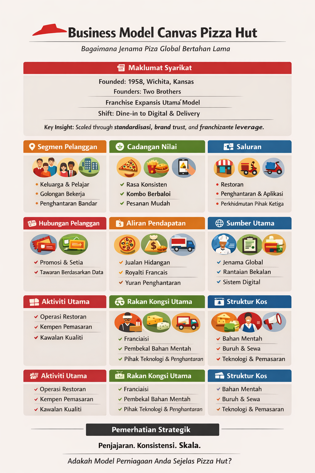 BMC Pizza Hut. Satu Analisis Model Perniagaan dengan Business Model Canvas. Pizza Hut ialah salah satu jenama piza global yang paling lama bertapak. Syarikat ini diasaskan pada tahun 1958 di Wichita, Kansas, oleh dua beradik dengan konsep piza makan di restoran. Dari masa ke masa, jenama ini berkembang pesat melalui sistem francais dan menjadi nama yang dikenali di banyak negara. Kejayaan awalnya didorong oleh konsep santai, hidangan keluarga, dan pengiktirafan jenama yang kukuh.