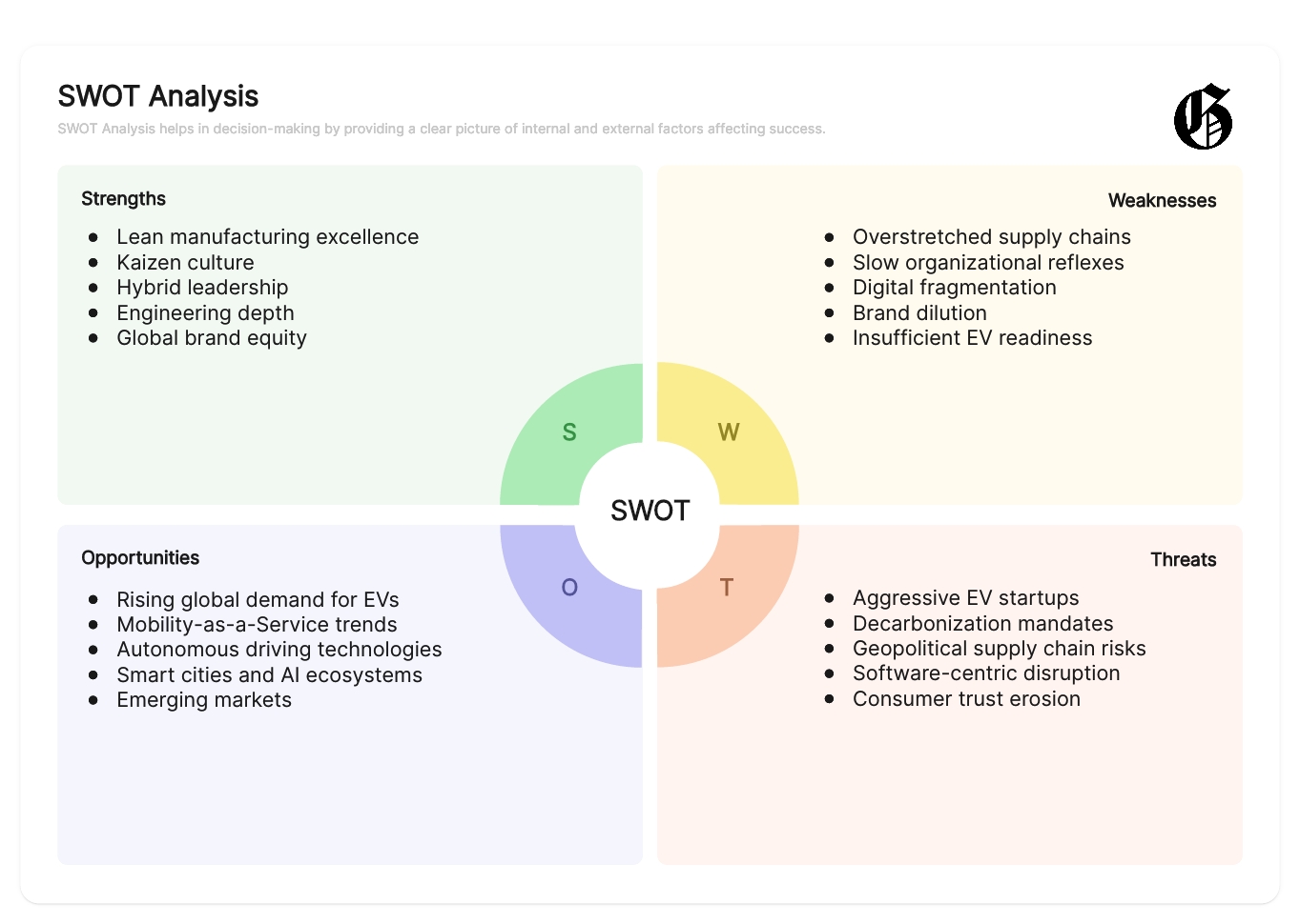 Toyota has always embraced structured thinking as a fundamental part of its decision-making culture. Tools like A3 reports, root cause analysis, and value stream mapping are deeply ingrained in its operational DNA. These methodologies have empowered continuous improvement on the production floor. However, when navigating strategic crossroads, Toyota turned to broader tools like SWOT analysis to reflect on external forces and internal capabilities simultaneously.