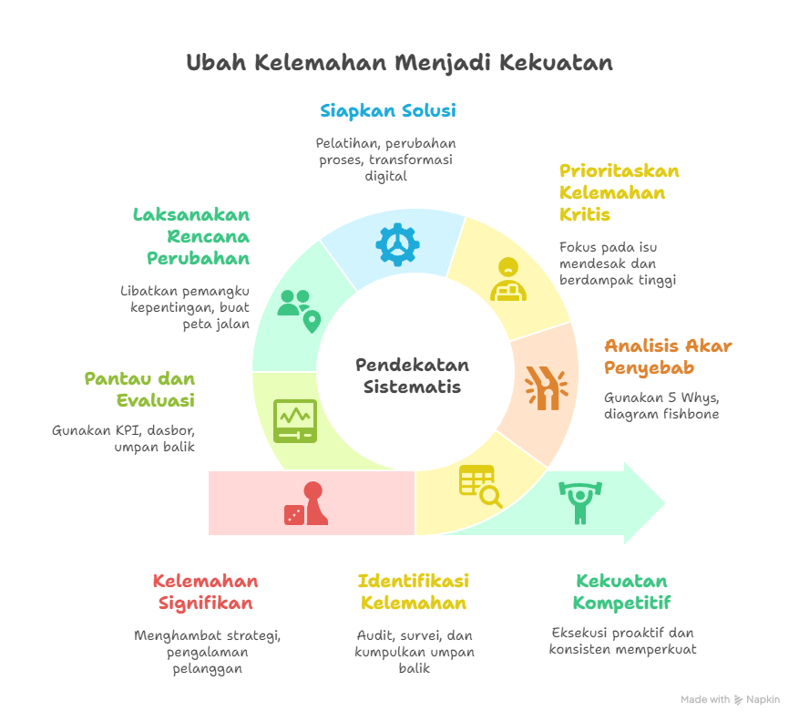Mengelola kelemahan memerlukan pendekatan sistematis dan terarah. Organisasi harus menindaklanjuti dengan langkah nyata. Berikut kerangka tindakan yang dapat diterapkan:
